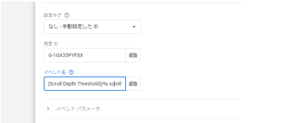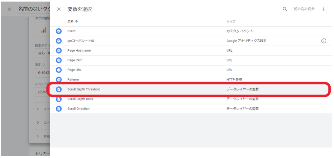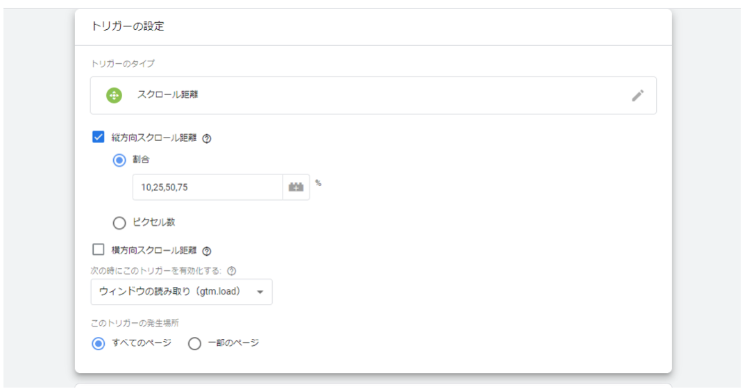 イベント設定のタブの中に、「scroll depth threshold」の項目があるのでこちらを選択します。
