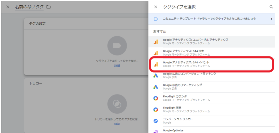タグタイプは「GA4イベント」を選択
