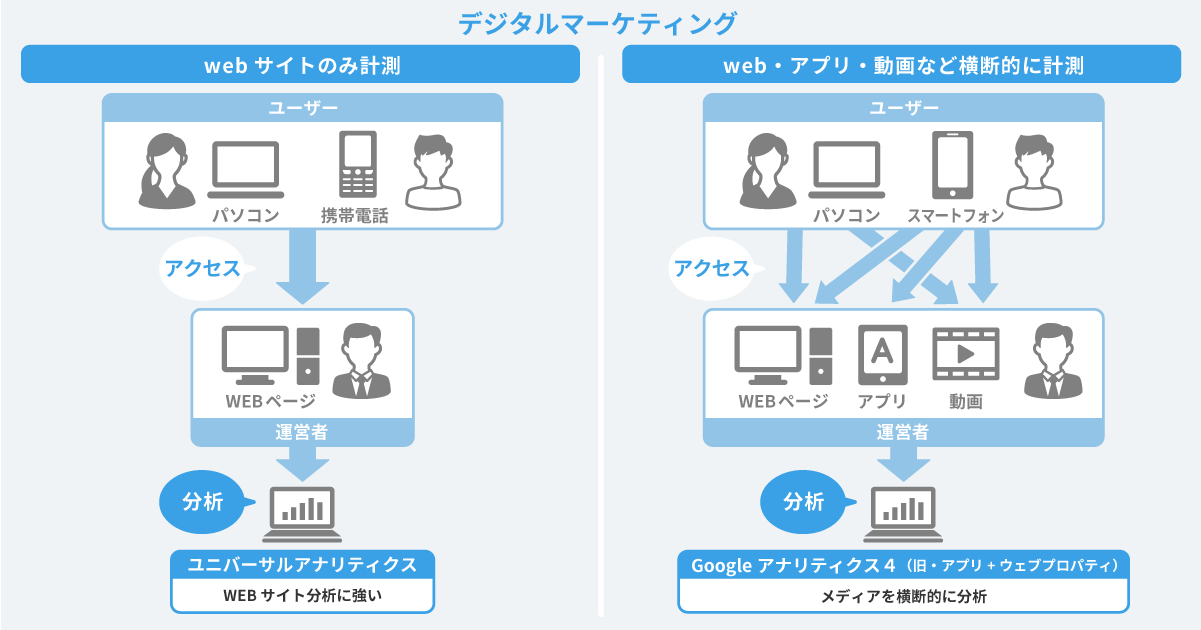 GA4はユニバーサルアナリティクスではできない、さまざまなアクセス解析が可能となります。ウェブとアプリの横断的な計測や機械学習による予測計測など、長期的なマーケティング戦略に活かせる機能を兼ね備えています。