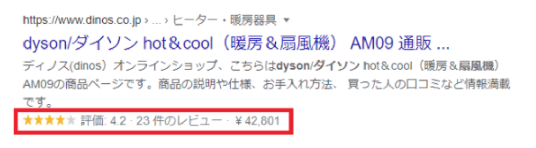 商品のリッチリザルトは、商品の価格やレビュー、在庫状況といった情報を表示させます。