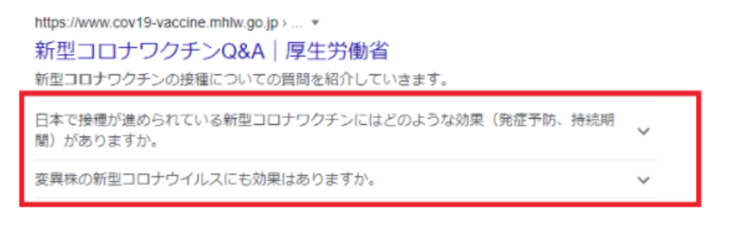 FAQのリッチリザルトは、サイト内のFAQ(よくある質問)とその回答の一覧を検索結果に表示させます。