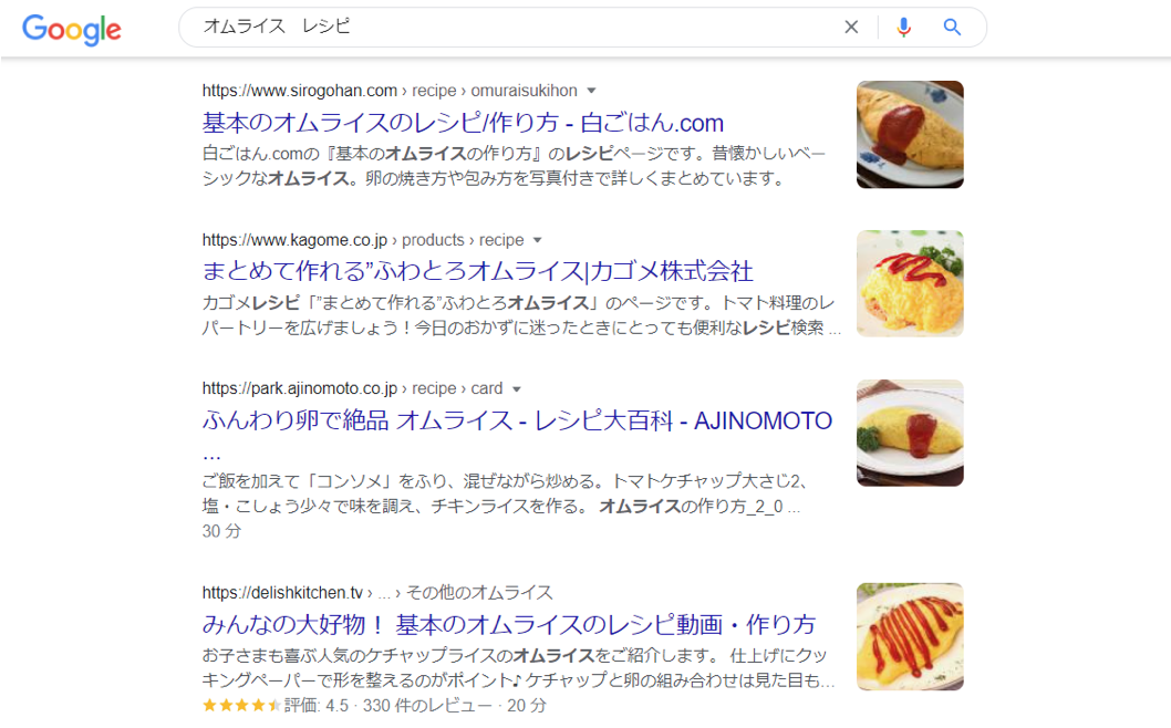 例えば、レシピや企業名、商品やサービスのレビューを検索した際に、リッチスニペットが表示されることが多いです。
