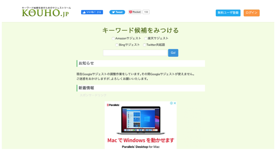 KOUHO.jpは、Google、Amazon、楽天、Bingのサジェストキーワードが取得できる、無料のサジェストツールです。サジェストキーワードが50音順で表示されるため、気になるサジェストキーワードをすぐに見つけられます。サイト内の検索ボックスにキーワードを入力するだけのシンプルな設計なので、誰でも簡単にサジェストキーワードを取得できます。